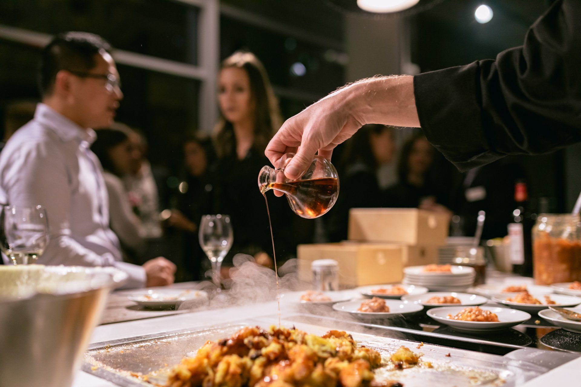 Entrecôte: 1.2 kg Entrecôte4 TL Steinsalz1 EL Hoch erzitzbares Öl8 Pr. Pfeffer aus der Mühle1 Knoblauchknolle3 Zweige Rosmarien3 Zweige Thymian50g Butterschmalz 200g CocktailtomatenDen Tepan auf 210°C oder Stufe 8 einstellen. Das Fleisch salzen und mit etwas Bratöl auflegen und Scharf braten. Eine aufgeschnittene Knoblauchknolle, etwas Rosmarin, Thymian und evtl. Salbei darauf verteilen. Nach 3-4 Minuten (wenn es sich von selber löst) wenden, mit Butterschmalz beträufeln und weiter braten bis die Fleischsafttröpfchen oben zu sehen sind. Eine Hand voll Coktailtomaten dazu legen. Dann auf kleiner Stufe 10 Minuten ruhen lassen.Mit dem Räuchersalz, Pfeffer und Gewürzen nach Wahl würzen. Pilze gebraten 500g Champignons oder andere Pilze100ml Weißwein oder Cherry1 Zwiebel fein geschnitten250 bis 500 ml Sahne, je nach bedarf1 Bund PetersilieSalzPfefferKümmel gemahlenDie Pilze vierteln und auf die Bratenrückstände geben, anbraten auf Stufe 7/200°C, die Zwiebel fein geschnitten zugeben und mit Weißwein oder Cherry ablöschen. Anschließend die Sahne zugeben und mit der fein gehackten Petersilie bestreuen. Mit Salz, Pfeffer und einer Prise gemahlenem Kümmel abschmecken. Kandierte Tomaten 16 Cocktailtomaten halbieren, etwas Zucker in einer Pfanne oder auf der Tepan Edelstahlgrillplatte karamellisieren und die Tomaten einlegen. Mit Olivenöl beträufeln und mit Salz, Pfeffer und ein paar Zweige Rosmarin würzen.